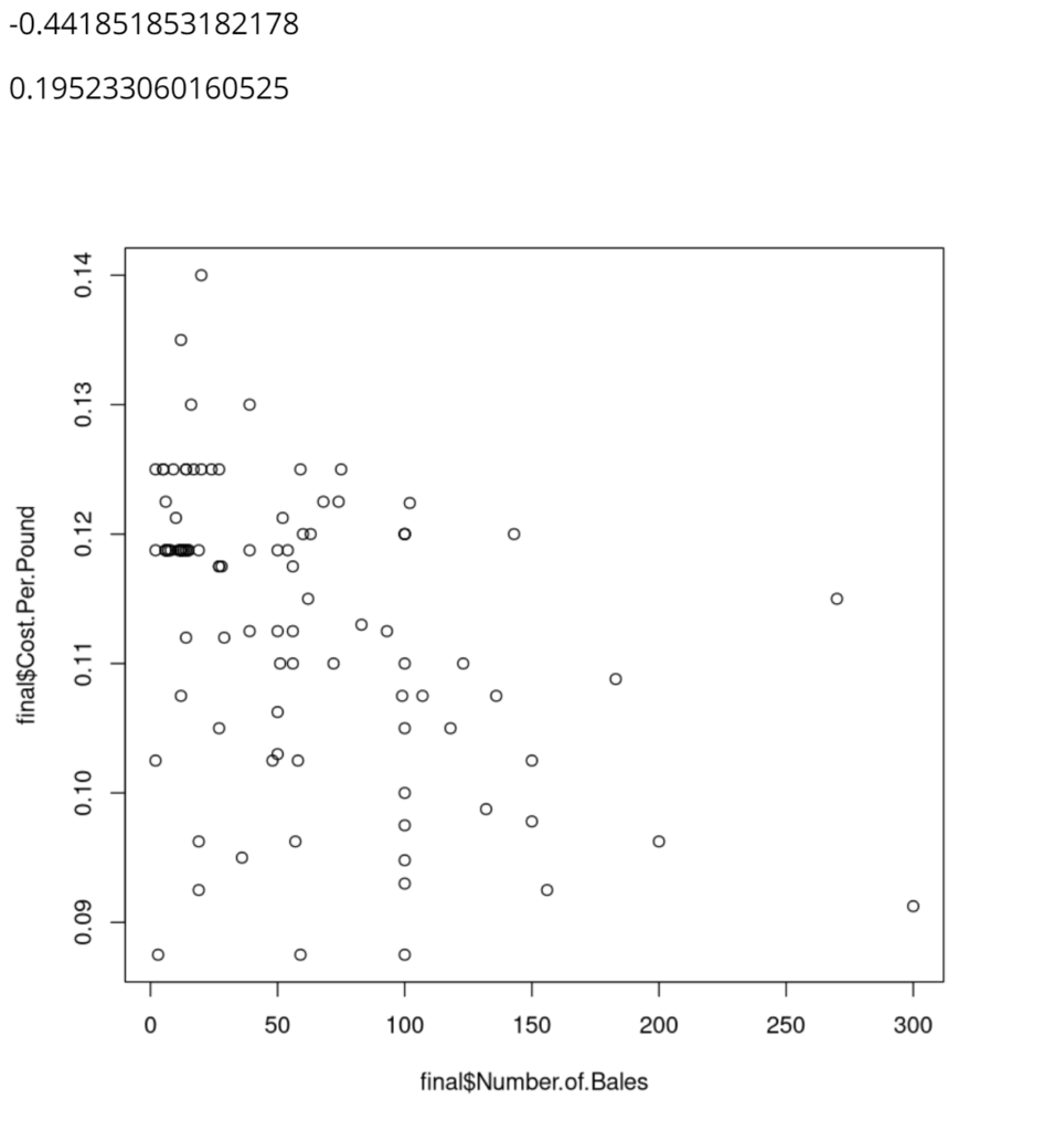 The first line of code uses the plot() function to create a scatterplot of the data for the number of bales and the cost per pound from the Bates Mill Company Financial information dataframe. The scatterplot above shows this data. While it is pretty spread out, it is clear that there is a general downward trend — meaning that as cost per pound increases, number of bails decreases. The first number displayed above the graph, -0.44185, represents this correlation proving that it is a fairly weak and negative relationship. The second line of code calculates this number using the cor() function and the same data used in the scatterplot. The third line of code uses the same cor() function but squares the value in order to calculate how much of the variation of the number of bales of cotton can be explained by the cost per pound. The calculation was fairly low, 0.19, which means that only about 20% of the variance of the number of bales is a result of the cost per pound.